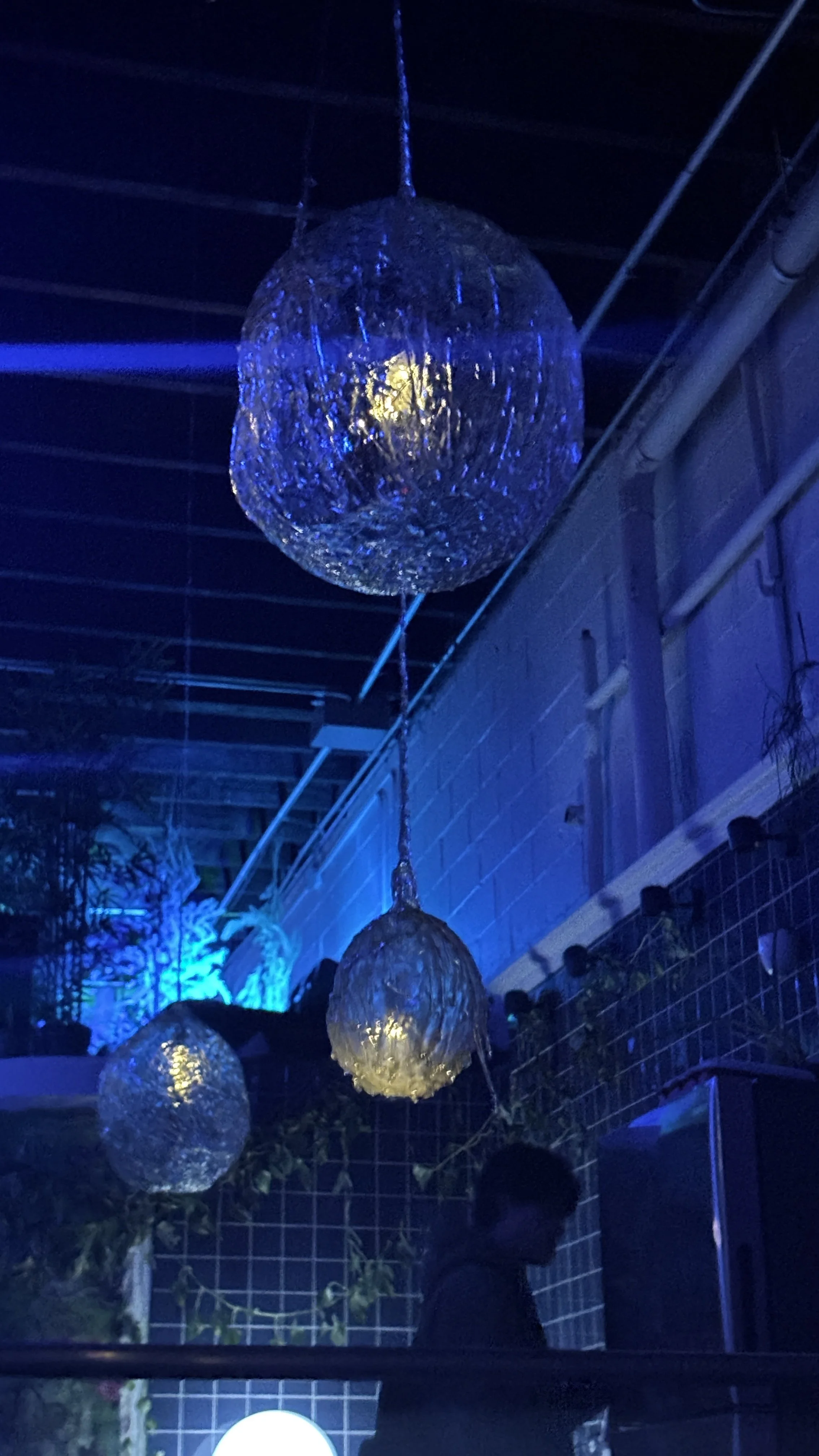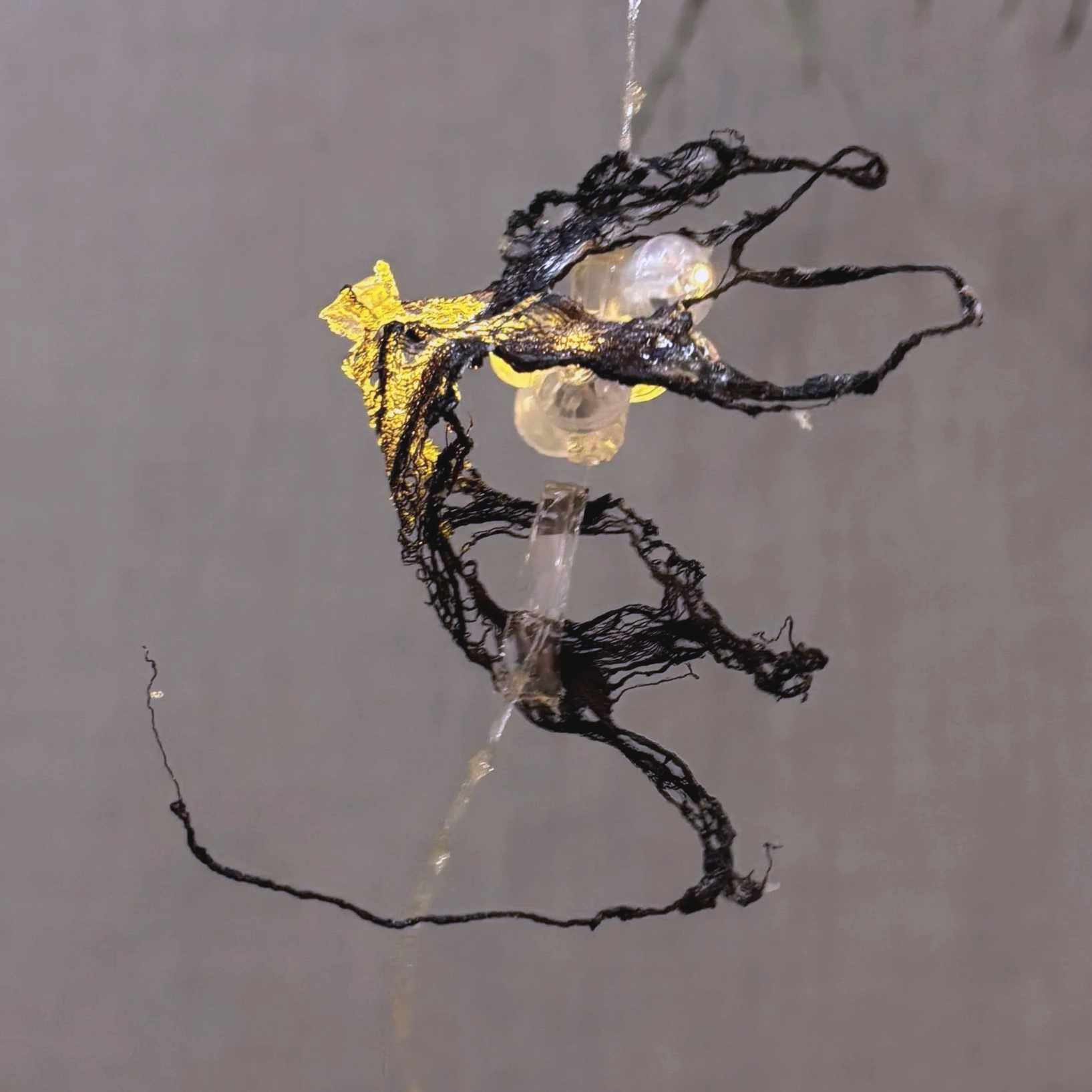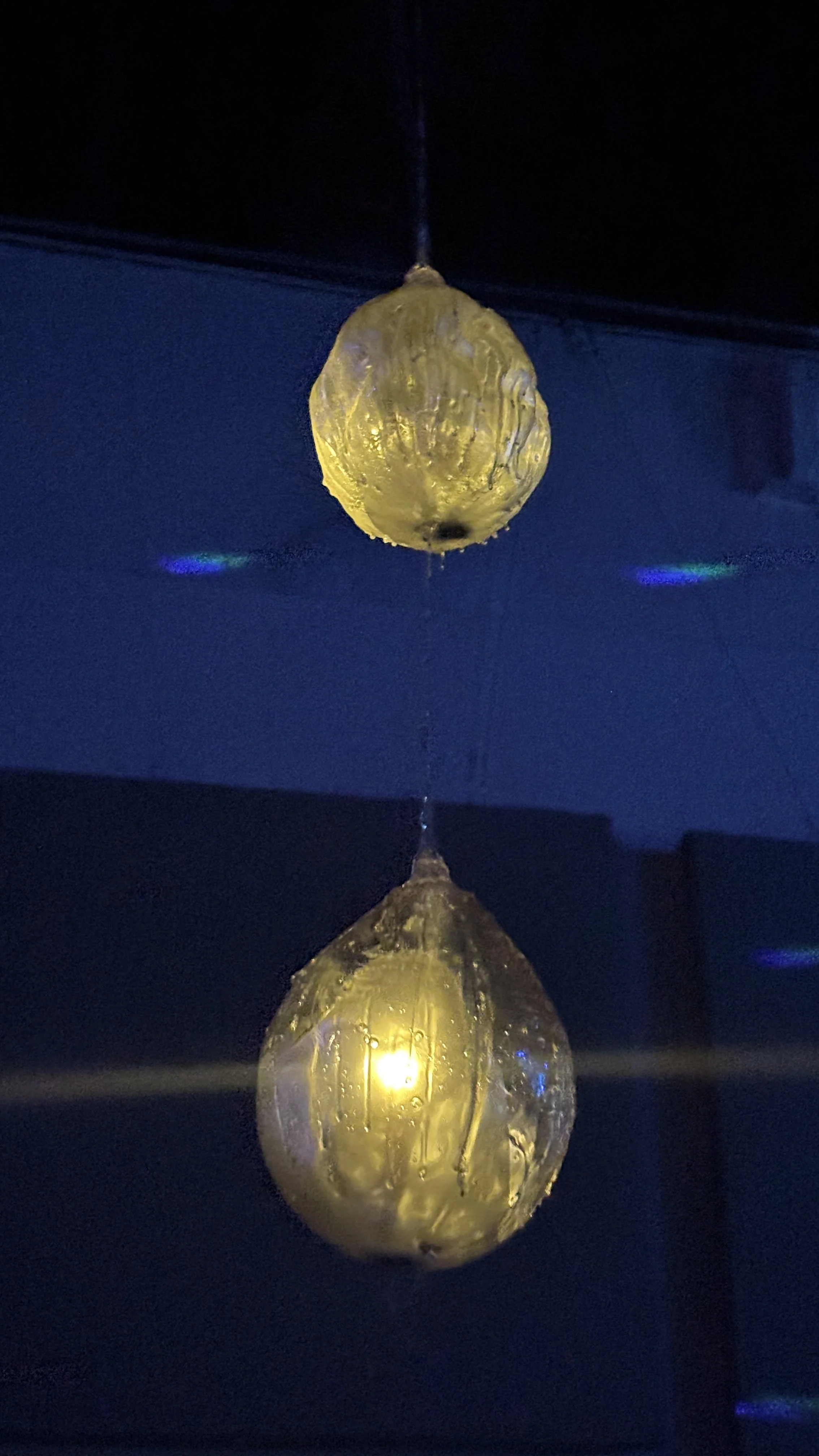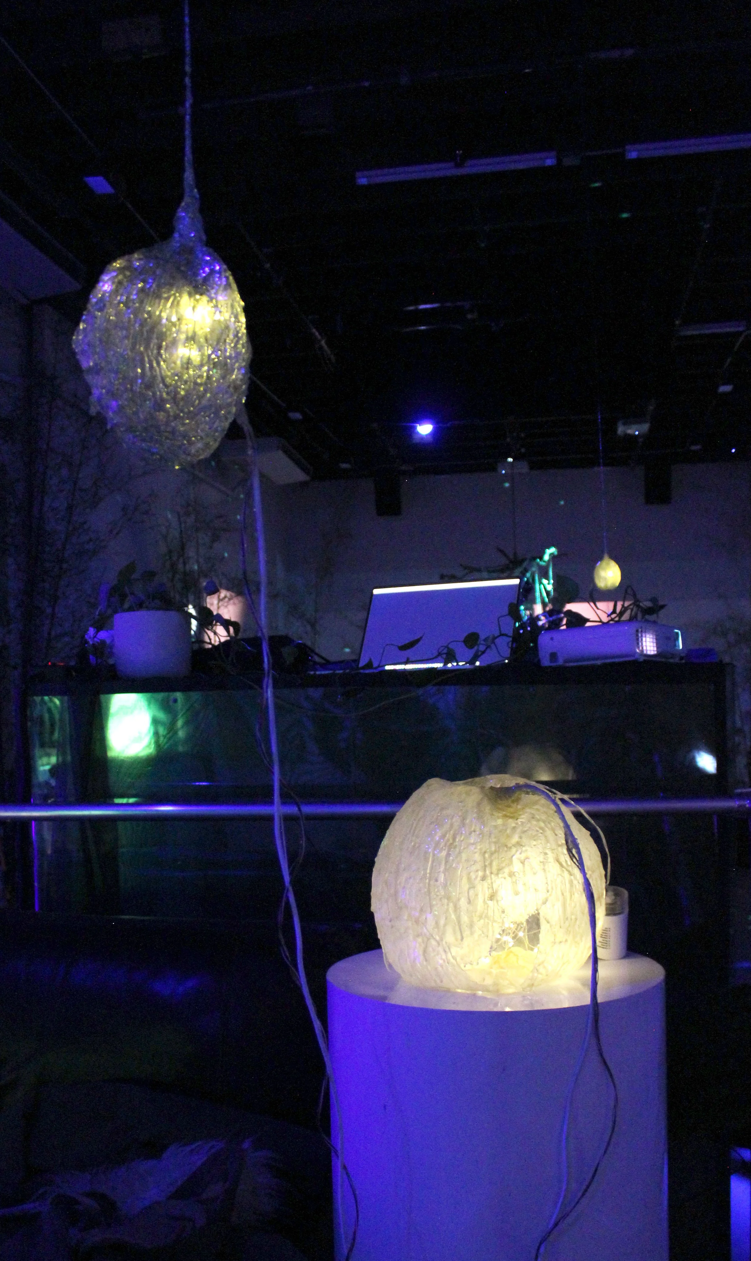 Composed of a series of various sized suspended bioplastic eggs with light and fetal forms held within. The biomaterial is composed of gelatin and carrageenan, which are biopolymers derived from animals and algae respectively. The primordial egg is a microcosm which creates an ecosystem for all life in its beginning cellular stages, providing a home in which all necessary nutrients are funneled and stored for the fetus to gain enough strength to emerge. The egg is the realm in which all living beings are unified prior to differentiation. Through relating to our common form, I can only hope to highlight our unity and adapt to our changing ecosystem with more care.