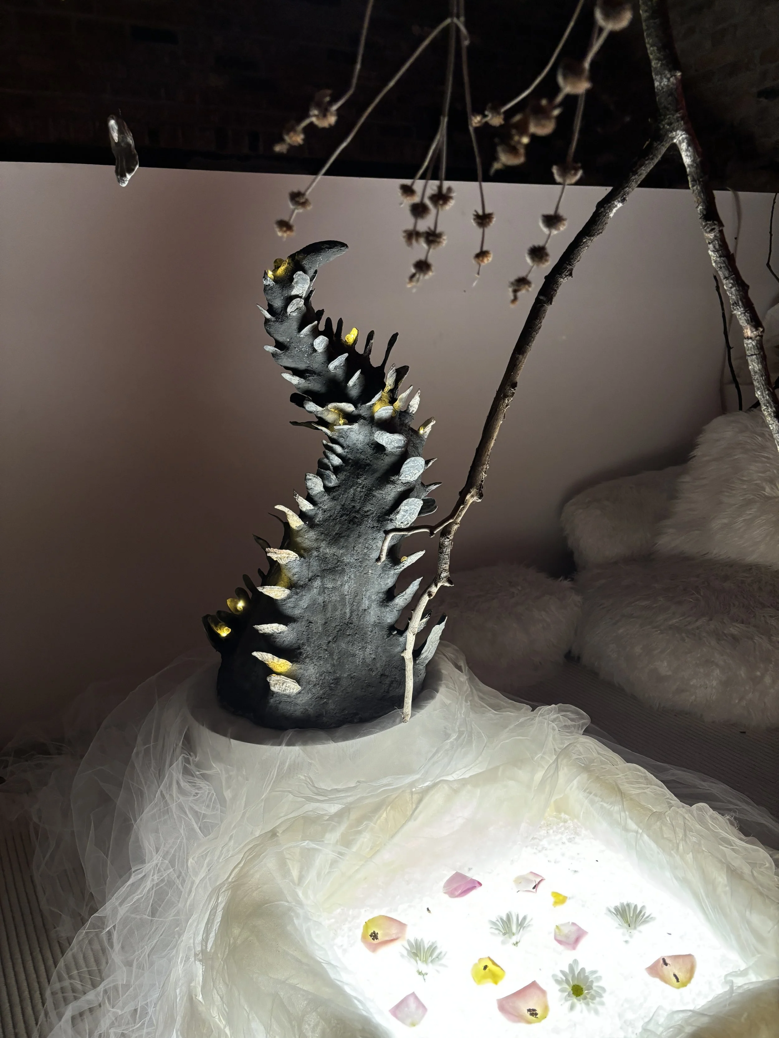 Ediacara + Reflection Pool: concrete, charcoal, oyster shells, light, hydrogel, plexiglass, flowers, fabric
